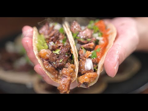 スアデロは、メキシコ料理の中でも特に人気の高いタコスの具材です。牛肉の中でも薄い層の部位を使うため、肉の食感がとてもジューシーで濃厚な味わいが特徴です。日本の一般的なスーパーでは手に入りにくい食材ですが、動画では手に入りやすい部位を使った代替レシピが紹介されています。